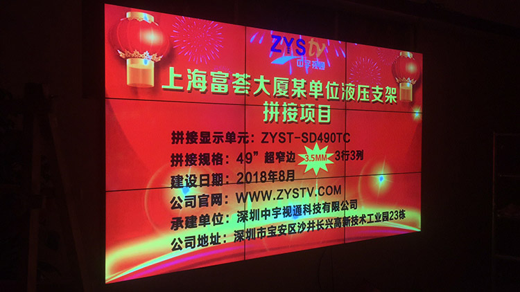 上海富薈大夏某單位49寸液壓支架拼接屏項目采用中宇視通科技大屏液晶拼接方案,項目安裝調(diào)試完成并順利簽收。