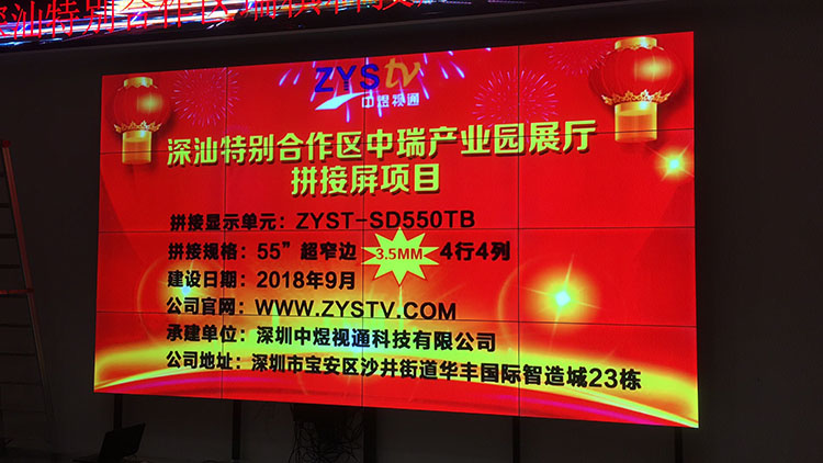 深汕特別合作區(qū)中瑞產(chǎn)業(yè)園展廳55寸3.5mm拼縫液晶拼接屏項目,安裝調(diào)試完成并且順利驗收,中宇視通科技全體員工從深圳發(fā)來賀電!