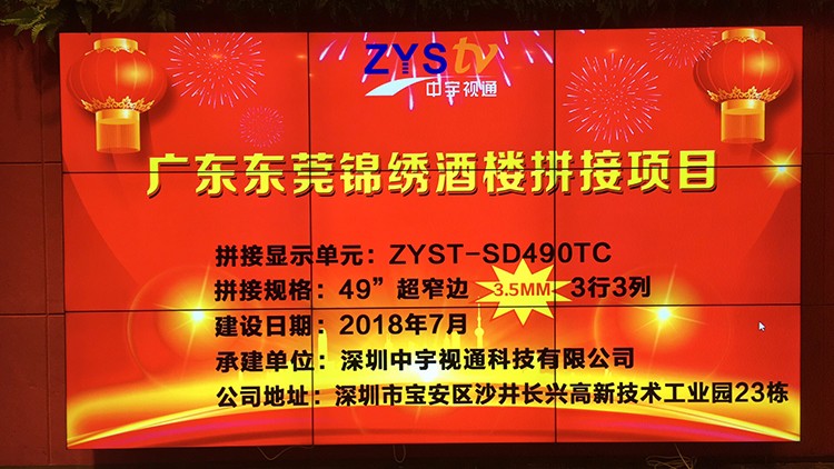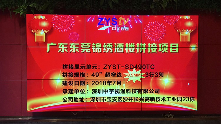 廣東東莞市錦繡酒樓選用深圳中宇視通科技49寸3.5拼縫拼接屏項(xiàng)目安裝調(diào)試完成且順利通過驗(yàn)收。