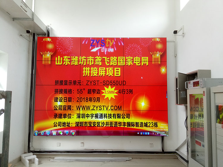 山東濰坊市鳶飛路國(guó)家電網(wǎng)55寸3.5mm拼縫4行3列液晶拼接屏項(xiàng)目,安裝調(diào)試完成并且順利驗(yàn)收,中宇視通科技全體職工從深圳發(fā)來(lái)賀電!