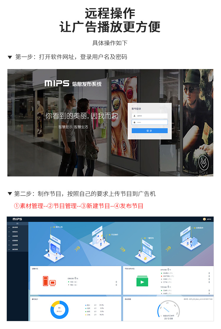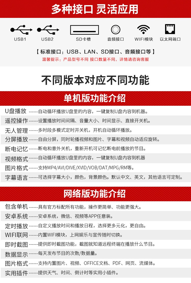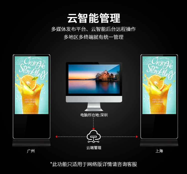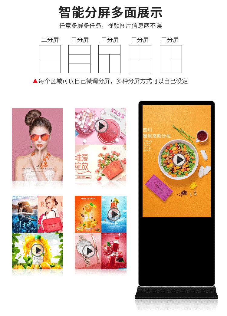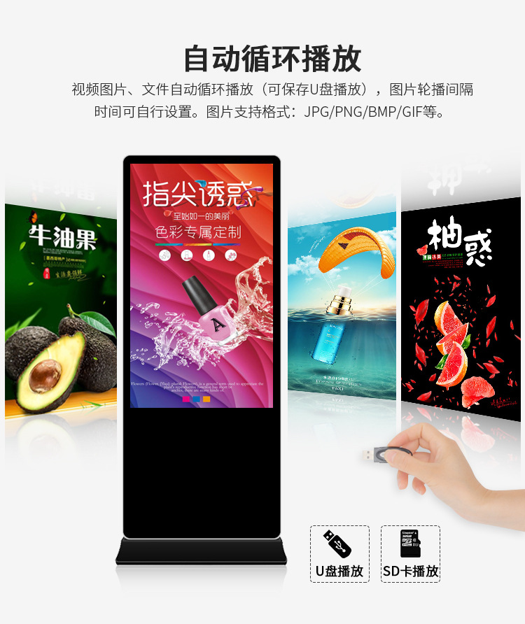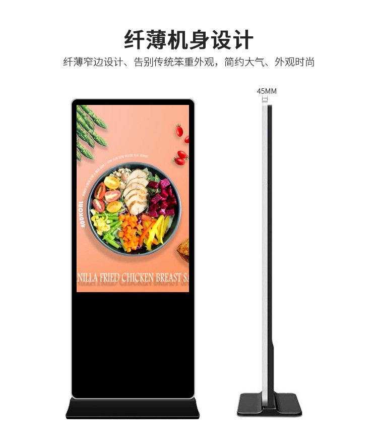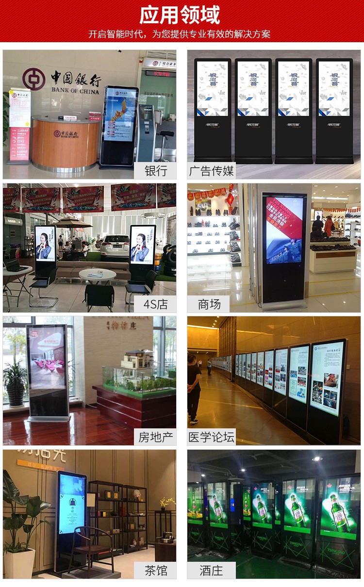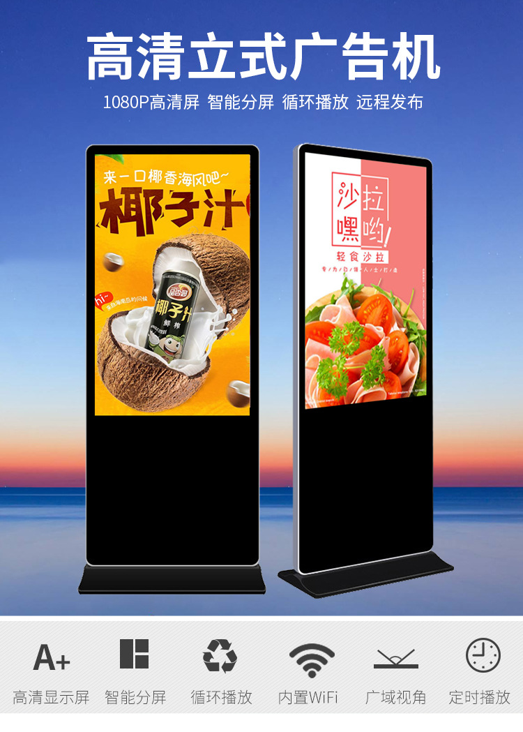 65寸立式液晶廣告機系列產品屬于壁掛、落地式數字標牌廣告機,外觀優美,全身五金冷軋鋼板噴涂,邊條鋁合金型材,面板4MM專用鋼化玻璃,橫式16:9液晶屏,高清效果。內屏采用三星、LG原裝工業級液晶屏,配以最先進的密集型LCD光源背光系統,背光色彩還原度好,超高對比度,強光下依然清晰無比。特別適合高端品牌的綜合多媒體技術,向消費者傳遞全方位的產品信息,促銷信息等。提升產品在銷售終端的顯現率和陳列效果,刺激沖動性購買。相比于其他傳統媒體和促銷方式,投入極低廉,性價比極高。